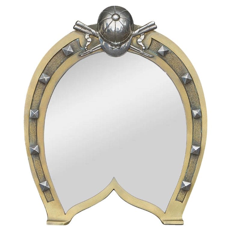 A whimsical yet finely crafted 19th century English table mirror, cast in brass in the shape of a stylized horseshoe, complete with studded nail heads and topped with a sculptural arrangement of crossed pistols, a riding crop, and a domed helmet. This eccentric yet handsome piece blends novelty design with function and would likely have adorned a gentleman’s dressing table or sportsman’s interior. The polished brass construction retains a warm, aged patina throughout, enhanced by the raised and textured surface surrounding the mirror, which plays against the cooler gleam of the silvered metal embellishments.