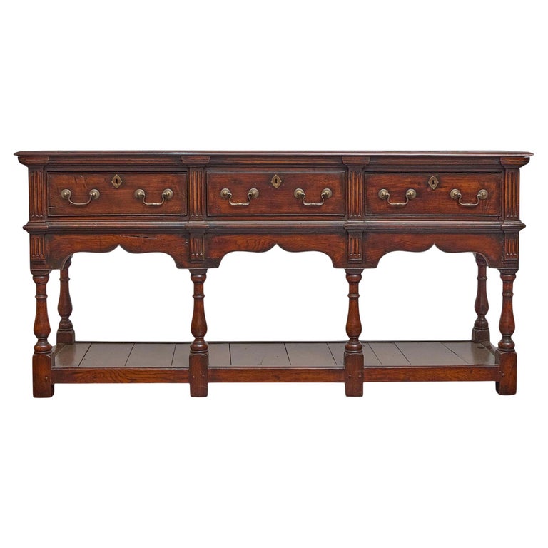 An English oak dresser base from the 19th century, featuring a warm, rich patina and classic Georgian-inspired lines. Measuring 66 inches wide by 18 inches deep and 32 inches high, this substantial piece is crafted from solid oak with a well-figured grain, deep coloring, and traditional joinery. The upper section comprises three drawers fitted with brass bail handles and period-style escutcheons, framed by fluted vertical accents that divide the façade.