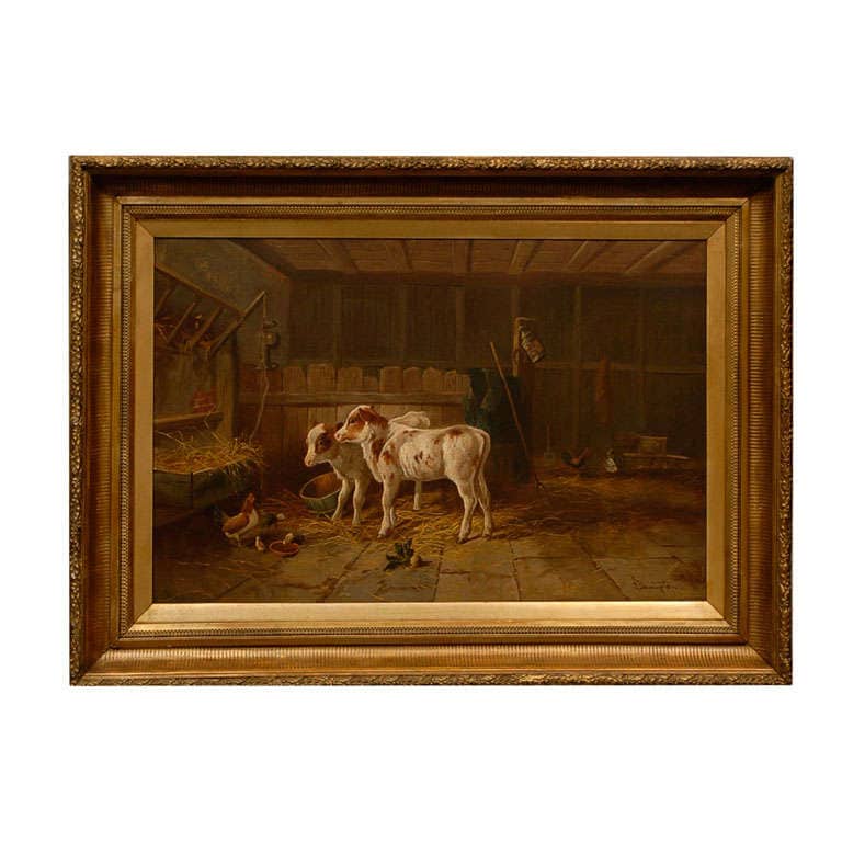 An English 19th century oil on canvas painting depicting farm animals in a barn in giltwood frame. This English farm painting features two lovely calves that seem to be hesitantly standing on their young legs, walking towards a trough full of hay that is placed in front of them. A hen, surrounded by her chicks who are drinking from a small bowl, seems to be keeping an eye on everything. In the distance, a rooster completes the composition. The depth is given by the simple, rustic architecture of the barn. This simple scene, bathed in a soft light, exudes a serene atmosphere, making this English 19th century painting an excellent choice for any room. Set within a giltwood frame with carved moldings, this painting is signed R. Hannington lower right.
