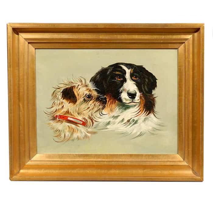 English circa 1880 oil on canvas of two “friends” in a giltwood frame, a terrier and a sporting dog with playfull expressions.