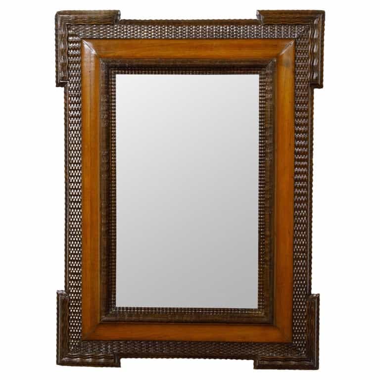 A Dutch walnut wall mirror from the 19th century with hand-carved décor, protruding corners and brown patina. This exquisite Dutch walnut wall mirror from the 19th century captures the essence of timeless elegance with its hand-carved décor, protruding corners, and rich brown patina. The frame showcases a meticulous rhythm of carved details that beautifully alternate with a smooth section, creating a harmonious balance and visual interest. The protruding corners add a dynamic element, enhancing the mirror’s architectural appeal and making it a striking focal point. The brown patina enriches the walnut wood, highlighting its grain and enhancing the intricate carvings. This masterful craftsmanship reflects the artistry and attention to detail characteristic of the period, ensuring the mirror’s enduring beauty and historical charm. Perfect for various settings, this Dutch wall mirror can be placed in a living room, bedroom, or hallway, where it will add a touch of sophistication and depth. Its ability to reflect light and create the illusion of more space makes it both a functional and decorative piece. Whether hung above a mantel, console table, or as part of a gallery wall, this 19th-century mirror will elevate your interior décor with its refined aesthetics and timeless appeal. The combination of intricate hand-carved details, protruding corners, and a warm brown patina ensures this mirror will be a cherished addition to any home. Its blend of historical significance and artistic beauty makes it a versatile and elegant choice for enhancing both traditional and contemporary interiors. This Dutch walnut wall mirror is not only a reflection of craftsmanship but also a statement piece that enriches your living space with its rich heritage and exquisite design.