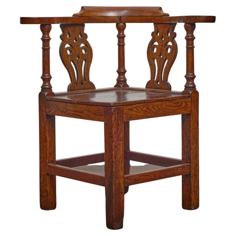 Corner chairs were valued in the 18th and 19th centuries for their compact footprint and their versatility, easily positioned in the corner of a room or pulled forward for use at a desk or writing table. This example reflects the robust qualities of English oak furniture, with warm tones and a patinated surface developed over time. The generous proportions and solid joinery ensure practical stability, while the traditional details lend character and historic charm. Ideal for a library, study, or accent seating in a country house setting, this oak corner chair embodies both utility and decorative presence.