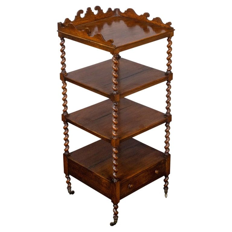 An English walnut barley twist four-tiered shelf with lower drawer, casters and carved three-quarter gallery at the top. Introduce the classic charm and functional elegance of this English walnut four-tiered freestanding shelf into your home, a piece from the era of intricate craftsmanship. This shelf, with its exquisite barley twist supports, lower drawer, casters, and carved three-quarter gallery at the top, is a testament to the refined aesthetics and meticulous attention to detail of traditional English furniture design. The shelf’s structure is graced by barley twist supports, their spiral form not only providing sturdy support for the four tiers but also adding a decorative, sculptural element. The warm tones of the walnut wood lend the piece a sense of natural warmth and sophistication. At the bottom, a convenient dovetail drawer offers additional storage space, while the casters ensure easy mobility, allowing the shelf to be positioned effortlessly within your space. The top tier is framed by a carved three-quarter gallery, adding an element of grandeur and providing a secure display area for treasured items. In a modern home, this walnut shelf serves as a versatile and stylish piece. It can be used in a living room to display books and collectibles, in a study to organize documents and office supplies, or in a kitchen to hold spices and cookware. The shelf’s classic design and functional features make it a timeless addition to any interior, adding a touch of English elegance and the beauty of traditional craftsmanship to your space.