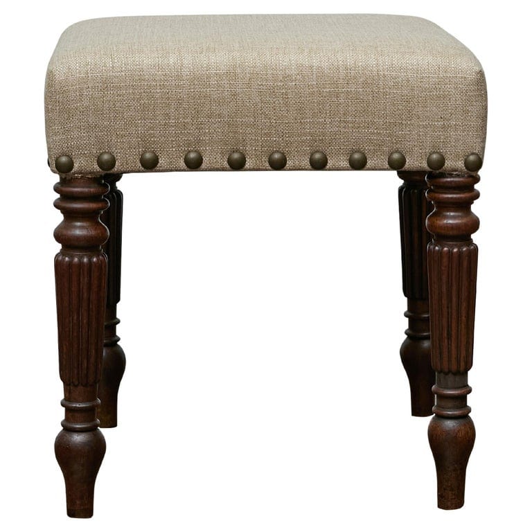 Rooted in 19th-century English craftsmanship, this mahogany stool balances refinement and function with its sculpted presence. The richly patinated wood showcases turned legs with reeded detailing, tapering into arrow feet that lend a graceful stance. A generously padded seat, newly upholstered in a neutral linen fabric, offers both comfort and a crisp contrast to the warm depth of the mahogany. A row of antique brass nailheads punctuates the perimeter, subtly accentuating the tailored lines.