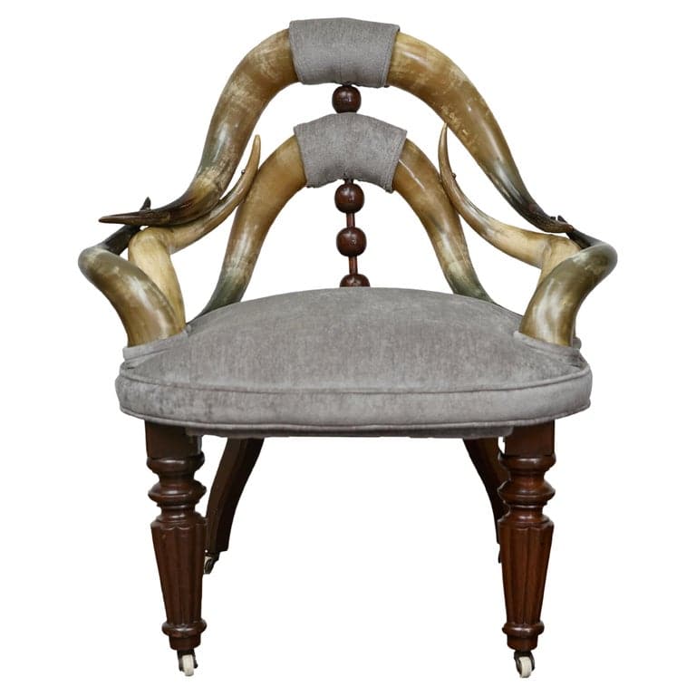 This striking English Victorian mahogany chair seamlessly marries rustic and refined elements, making it a true conversation starter. Crafted from polished horn arms that sweep gracefully around the back, the chair’s form captures a unique spirit of Victorian novelty. The curved horns, accented with soft fabric wrap details, bring an exotic touch to this traditional design. Its mahogany legs, richly turned and tapered, add both elegance and stability, while the casters offer subtle mobility, making it easy to position in any room. The seat and backrest are upholstered in a plush, grey-toned velvet or chenille fabric, enhancing the chair’s comfort and adding a contemporary contrast to the rugged horn arms. This upholstery choice allows it to integrate seamlessly into modern interiors while still retaining its historic charm. Perfect for a study, den, or eclectic living space, this horn-accented Victorian chair is an ideal piece for anyone looking to add character and a hint of adventure to their decor. Whether placed as a statement chair in a reading nook or paired with other antiques, it effortlessly brings together the exotic and the elegant. Its captivating design makes it a natural focal point, inviting guests to admire and inquire about its storied craftsmanship and unique materials.