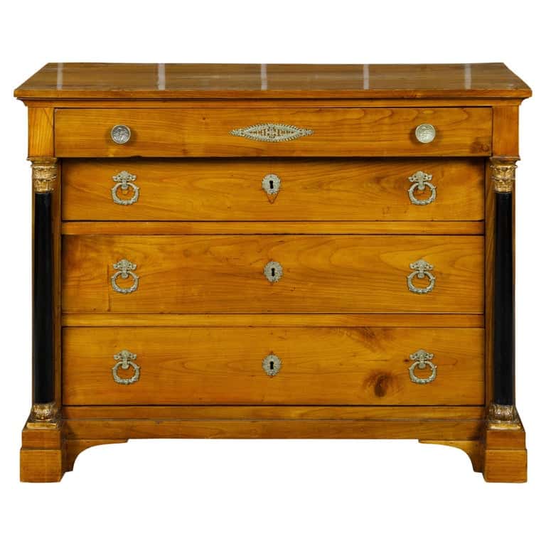 A French Empire fruitwood four-drawer commode from the early 19th century with ebonized columns, gilt Corinthian capitals and bronze hardware. This exquisite French Empire style fruitwood commode, dating from the early 19th century, effortlessly blends historical grandeur with functional elegance. Its classic silhouette is enriched by the warmth of the fruitwood, accented with ebonized columns that stand at each corner, leading the eye upwards to the delicate gilt Corinthian capitals—an homage to the rich architectural heritage of the Empire period. The commode features four generously sized drawers, each adorned with intricate bronze hardware, hinting at the luxury and opulence of the era. Bracket feet provide a solid foundation, grounding the piece in stability and style. The commode’s design is both timeless and versatile, making it a perfect addition to any contemporary home. It could serve as a statement piece in a living room, offering both storage and a display surface for art objects or floral arrangements. Alternatively, it might find a place in a spacious bedroom, where the rich textures and materials can be appreciated up close. Its historical roots, combined with the functionality of the drawers, offer a blend of aesthetic appeal and practical use that is rare in modern furniture pieces.