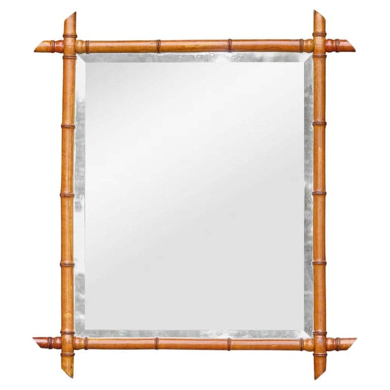 A rustic French faux bamboo wall mirror dating to circa 1900, framed in turned wood designed to mimic the warm, organic texture of bamboo. This mirror exemplifies the enduring popularity of the faux bamboo aesthetic that emerged in the late 19th century, echoing European fascination with Japonisme and exotic influences. The frame’s finely lathed segments are joined in stylized nodes, enhanced by pegged corner extensions that lend a sculptural flair.