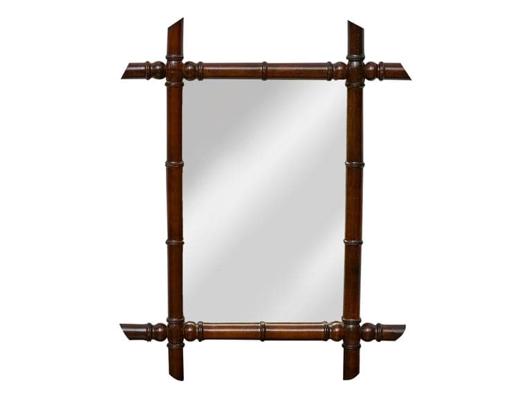 A charming faux bamboo mirror in walnut, crafted in France around 1900. This piece showcases the fine proportions and visual lightness associated with French faux bamboo work of the late 19th to early 20th century. The turned frame mimics the natural rhythm of bamboo culms with alternating smooth and ringed segments, enhanced by precisely carved joints and softly tapering finials at the corners.