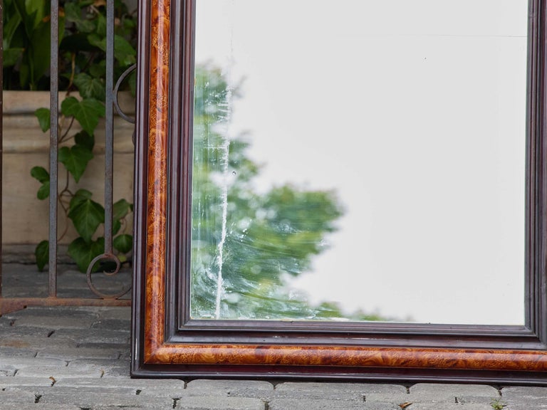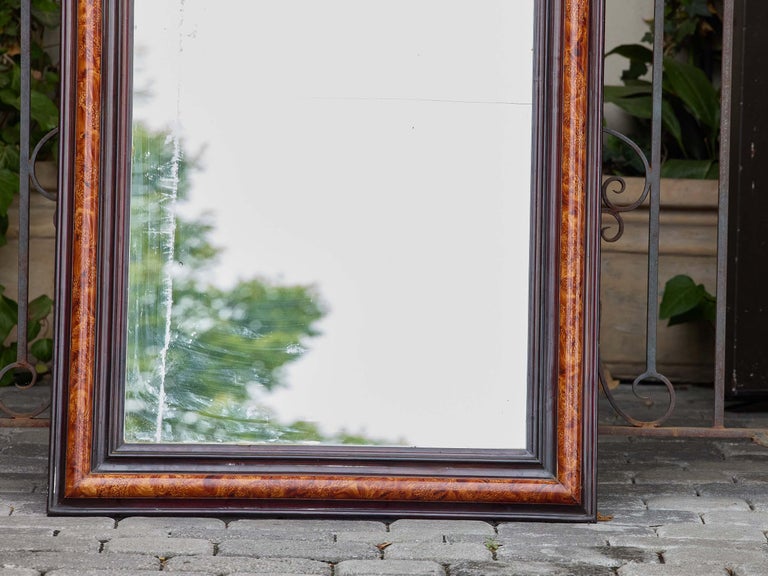 A French Louis-Philippe style mirror from circa 1920 featuring a richly colored faux tortoiseshell frame with rounded upper corners and a contrasting ebonized inner molding. The frame’s warm amber and dark brown tones emulate natural tortoiseshell, highlighted by its smooth, softly curved profile characteristic of the Louis-Philippe period. Elegant in its simplicity, the design emphasizes proportion and craftsmanship rather than ornament, creating a timeless presence that harmonizes easily with both classic and contemporary interiors.