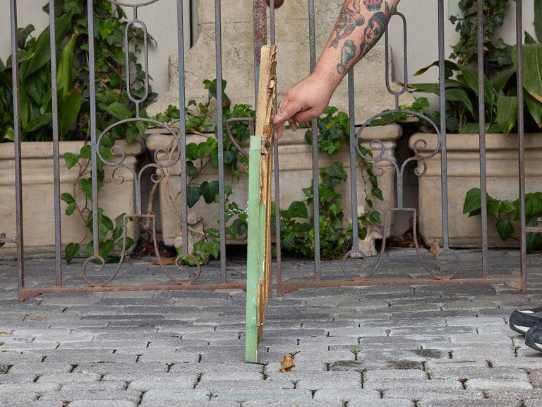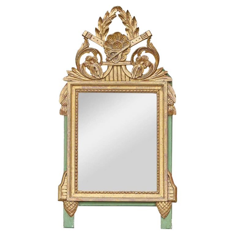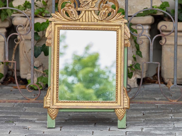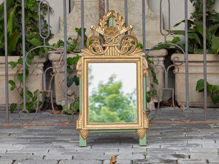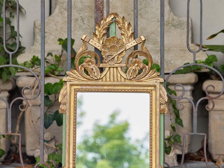 A charming French giltwood mirror in the Louis XVI style, dating to circa 1920–1930, featuring a finely carved neoclassical crest with crossed flutes, floral scrollwork, and laurel branches. The central rosette anchors the symmetrical upper motif, while side pendants, tassels, and notched corner blocks continue the classical vocabulary across the frame. The original gilt finish is paired with green-painted wood on the sides and feet—an unusual and playful color contrast that enlivens the traditional form.