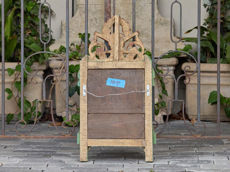 Measuring approximately 14.75 inches wide by 1.5 inches deep and 28 inches high, this mirror is ideal for a powder room, bedroom, or entryway. Its combination of classical ornament and colorful character makes it a versatile accent for interiors ranging from traditional to eclectic.
