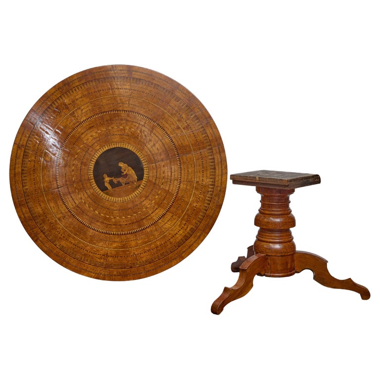 A masterful example of 19th-century Italian marquetry, this round Sorrento center table showcases the rich artisan traditions of southern Italy. The table features a dramatic veneered top inlaid with concentric decorative bands radiating from a central figural scene, meticulously rendered in contrasting woods. The vignette at the heart of the design depicts a classical moment—possibly a teacher and pupil—adding narrative charm to the table’s visual rhythm.