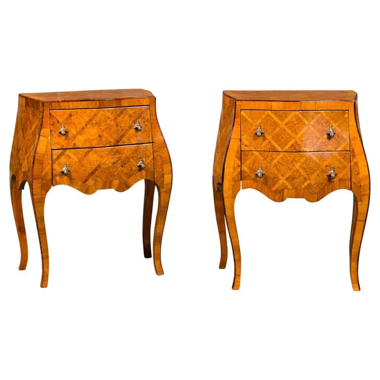 A pair of Italian Rococo style burl wood bedside chests from the Midcentury period, with two drawers, marquetry décor, serpentine front and cabriole legs. Indulge in the ornate charm and exquisite craftsmanship of these Italian Rococo style burl wood bedside chests from the Midcentury period. These elegant pieces are a testament to the refined aesthetics and intricate design characteristic of Italian furniture, making them a luxurious addition to any bedroom. Each chest is beautifully crafted from rich burl wood, its swirling grain patterns adding depth and visual interest to the surface. The serpentine front of the chests enhances their opulent appearance, creating a fluid and dynamic silhouette that is quintessentially Rococo. The chests stand on delicate cabriole legs, their graceful curves adding a touch of lightness and sophistication. The marquetry décor on each chest is a work of art, its patterns and designs showcasing the meticulous attention to detail and artistic skill of the period. With two drawers, these chests offer practical storage solutions while maintaining a sleek and refined appearance. In a contemporary home, these Italian Rococo style bedside chests serve as sophisticated and functional additions to a bedroom. They provide ample space for storing nighttime essentials while adding an element of grandeur and elegance. The chests’ rich burl wood finish and ornate details make them standout pieces that effortlessly blend with various interior styles, adding a touch of midcentury Italian luxury to your space.