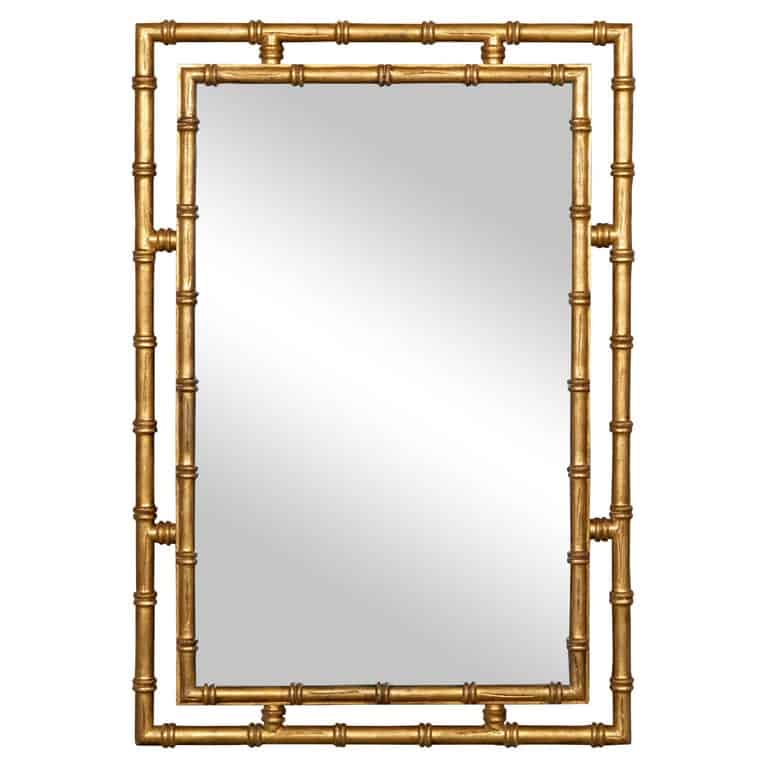 This Midcentury exquisite Italian gilt faux bamboo mirror from circa 1950 exudes a timeless elegance and refined craftsmanship. The mirror features an intriguing frame design, composed of two layers of faux bamboo meticulously gilded to enhance their natural beauty. The layers are separated by a narrow open space, creating a sense of depth and dimension, while petite connections delicately secure them together. The central beveled glass adds an additional touch of sophistication, reflecting light beautifully and enhancing the overall luminosity of the piece. The beveled edges of the glass create a subtle, prismatic effect, adding to the mirror’s allure and visual appeal. This mirror is perfect for a variety of settings, bringing a touch of vintage charm and elegance to any interior. It can be placed in a living room, hallway, or bedroom, where it will serve as both a functional piece and a striking decorative accent. The gilt faux bamboo frame seamlessly blends with both traditional and contemporary decors, making it a versatile addition to your home. Whether hung above a console table, mantel, or as a standalone statement piece, this Italian gilt faux bamboo mirror will elevate your space with its unique design and timeless beauty. Its combination of intricate faux bamboo detailing, rich gilt finish, and beveled glass ensures it will be a cherished addition, enhancing your decor with its elegance and historical charm.