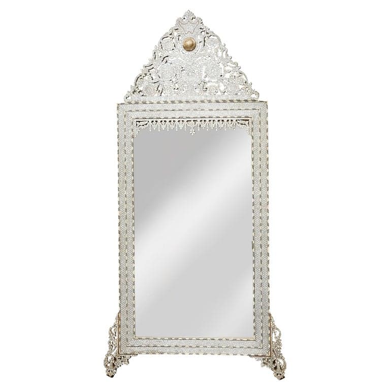An exceptional Moroccan mirror dating to circa 1900, featuring a tall rectangular form surmounted by a distinctive arched crest and resting on pierced bracket feet. The surface is richly adorned with intricate inlay work combining bone and mother-of-pearl.