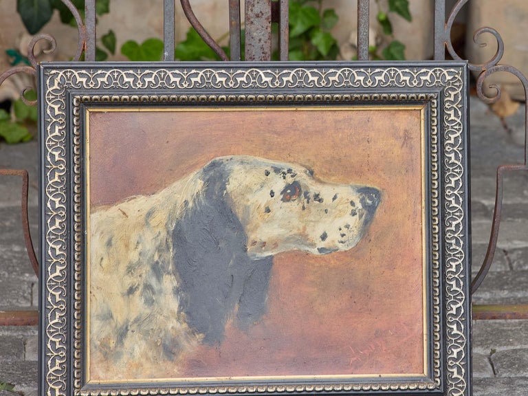 An evocative early 20th century oil on board portrait of an English Setter, dating to circa 1920. The artist captures the noble profile of the dog with sensitivity, highlighting its mottled coat, feathered ear, and attentive expression. The warm ochre and russet tones of the background contrast beautifully with the animal’s white and black markings, allowing the subject to stand out with quiet dignity.
