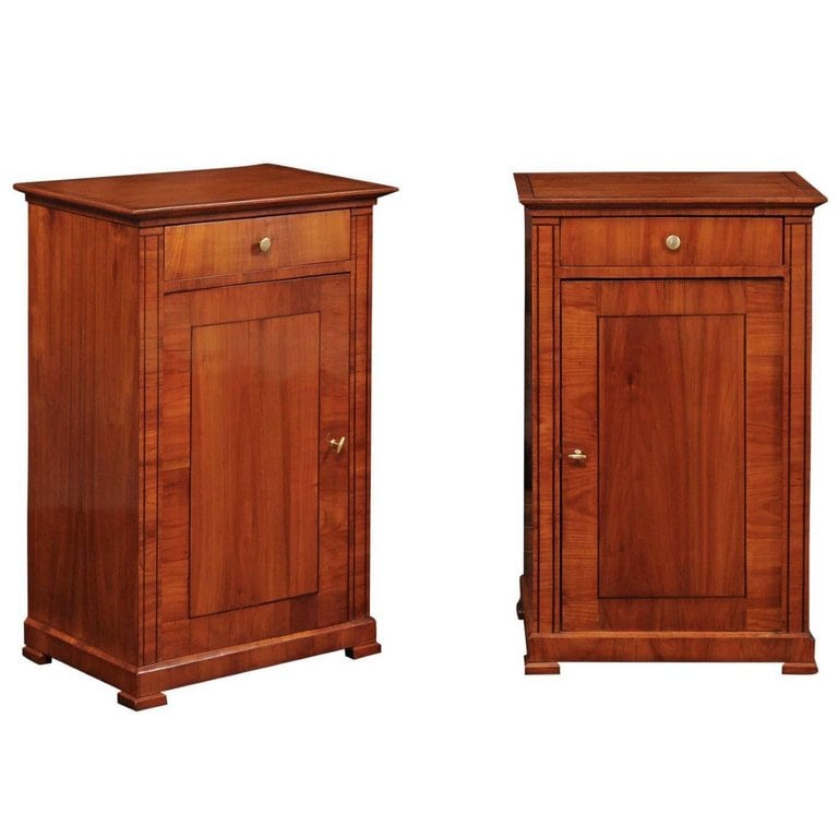 A pair of Austrian Biedermeier style walnut veneered cabinets with banded inlay from the second half of the 19th century. Each of this pair of Biedermeier stands features a rectangular top adorned with a thin banded inlay of darker color, sitting above a single drawer placed over a single door. Each dovetailed drawer opens thanks to a brass pull. The door echoes the banding of the top and shows a crossbanded veneer, revealing a beautiful wood grain. Each door opens in a direction opposite to the other one, making this pair of Biedermeier 1870s cabinets raised on square feet a perfect nightstand table. With their warm patina, lovely banding and elegant Silhouette, they will compliment any décor.