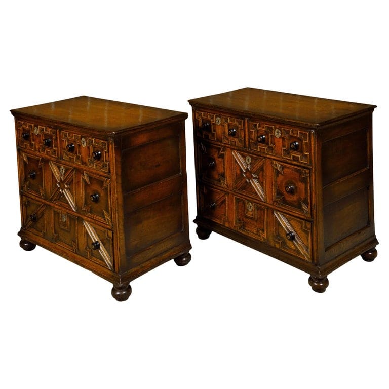 Pair of English 19th Century Oak Geometric Front Four-Drawer Carved Chests
