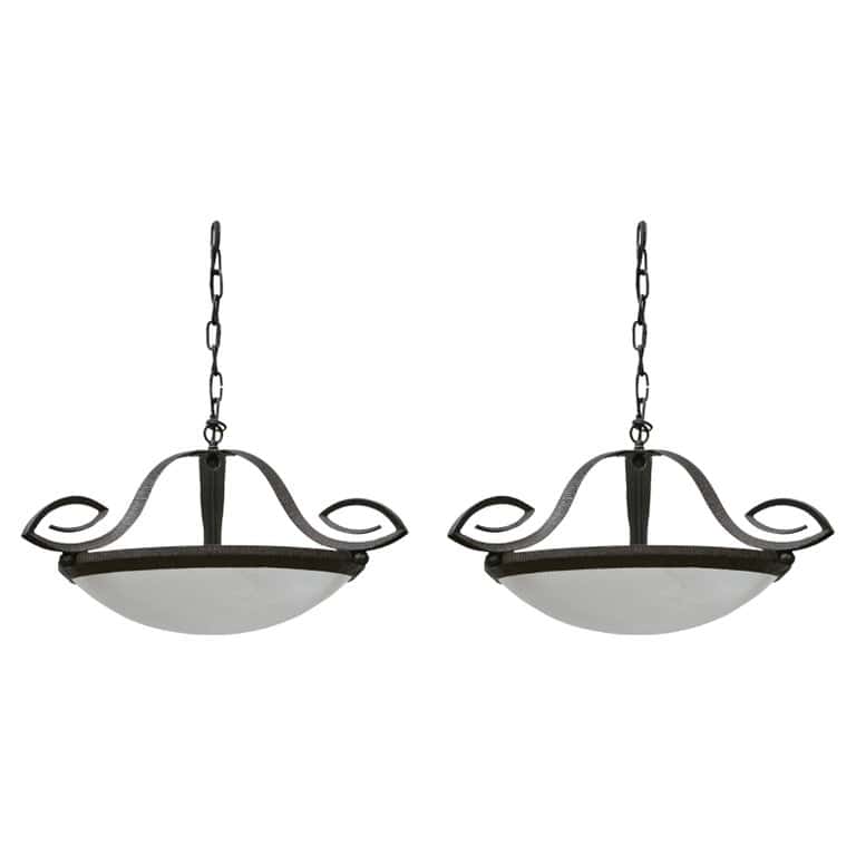 This pair of French ceiling light fixtures, dating to circa 1930, combines the natural elegance of alabaster with the sculptural strength of hand-forged iron. Each pendant features a carved alabaster bowl suspended within a robust hammered iron frame, the rim encased in textured metal and accented by dramatic curled scrolls that rise from the edge and arc upward with graphic flair. The curvilinear forms lend a decorative counterpoint to the otherwise industrial character of the forged material.