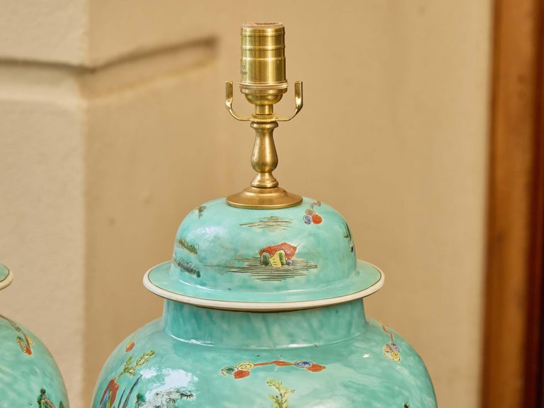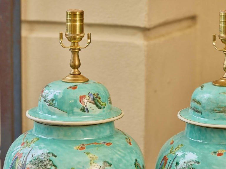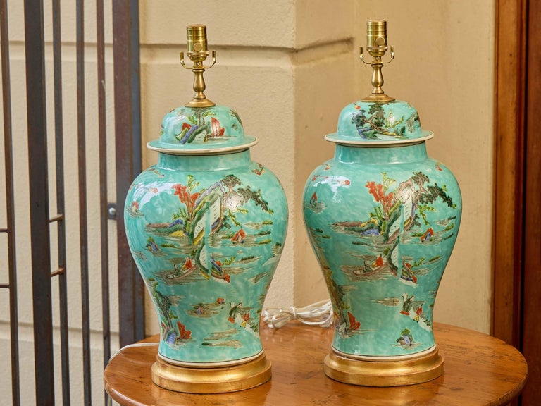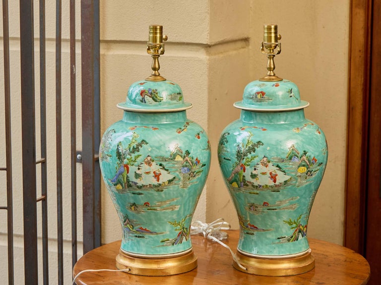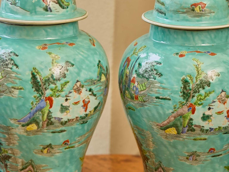 With their serene turquoise glaze and lyrical hand-painted scenes, this pair of Asian urns offers a moment of stillness—landscapes unfurl across the surface like fragments of a dream. Elegant figures walk among windswept trees, rocky cliffs rise from rippling waters, and distant pavilions perch in misty solitude, each brushstroke carefully applied in tones of coral, jade, ochre, and ink.