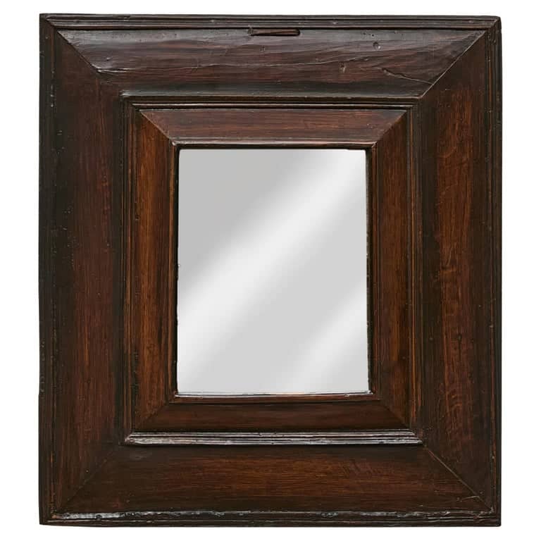 A quietly refined presence, this French mirror dates to the 19th century and features a warm walnut frame with deep moulding and rich patina. The square format gives the piece a sculptural strength, anchored by sharply beveled inner and outer edges that create visual depth and shadow play. The walnut shows traces of age in the form of small fissures and wear along the edges, adding to the mirror’s authenticity and character without compromising its structural integrity.