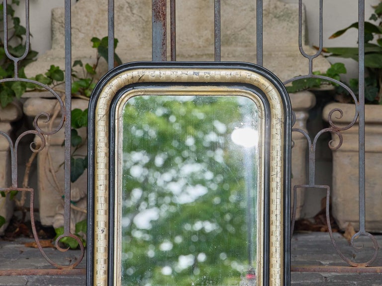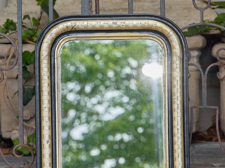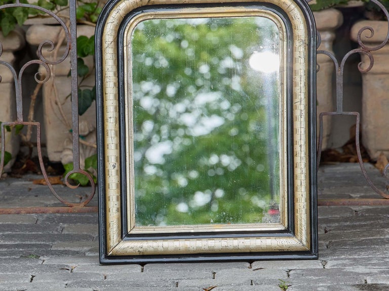 A petite Louis Philippe mirror from 19th-century France, distinguished by its rounded upper corners and subtly stepped frame. The surround features an outer border finished in deep black, enclosing a silvered inner band with a basketweave-like textured pattern that lends depth and visual interest. The combination of black and silver finishes creates a refined contrast, highlighting the mirror’s elegant proportions.
