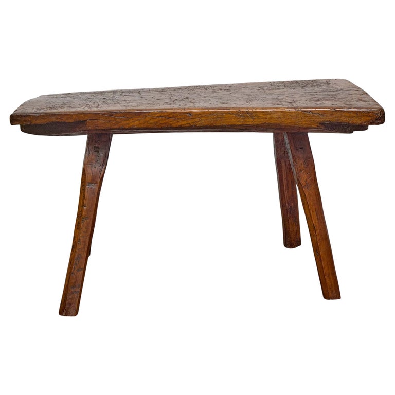 This early 19th-century Spanish work table or low bench is constructed from a single, thick slab of solid oak, supported by four splayed, mortised legs. The form is direct and utilitarian, rooted in vernacular craftsmanship rather than academic furniture traditions. The heavy plank top retains its irregular edges, tool marks, and surface undulation, all consistent with hand-worked construction and prolonged use.